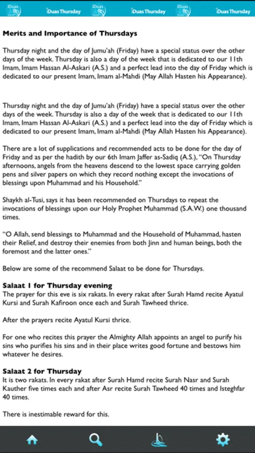 This app contains some of the recommended acts to be performed on Thursdays such as Dua Kumail, Ziyarat Waritha, Sura Yasin and Sura Insan. The app contains the Arabic text along with the English Translation. In addition, a brief overview of each item can be read. A special feature in this app is the ability to download MP3s which can be listened to while you read the Dua/Sura. You can also specify which Sura/Dua you want and customize to your choice.