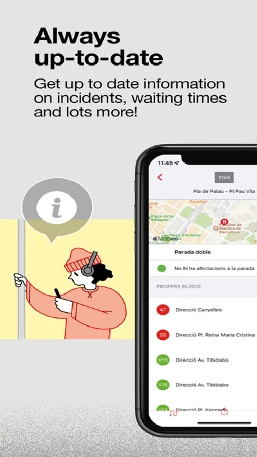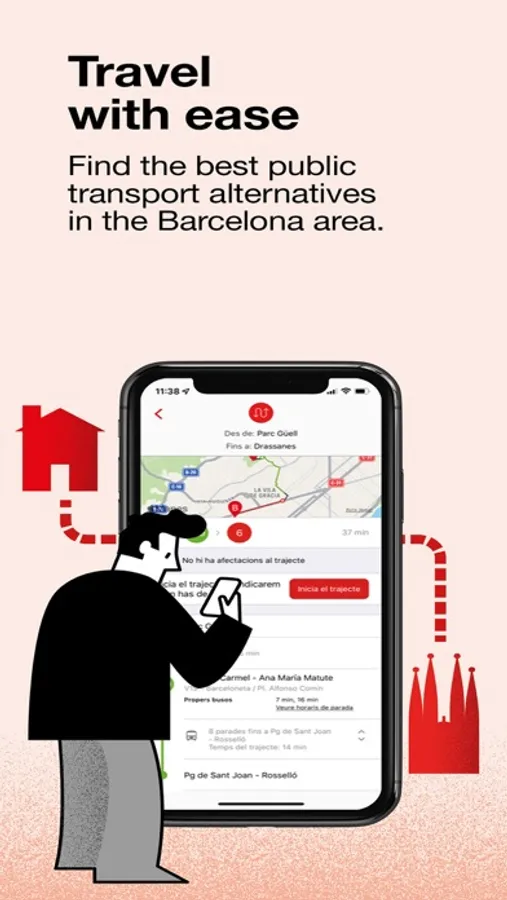Have all the information on the public transport network at your fingertips andmanage T-mobilitat from TMB App. TMB App is free and available in six languages.