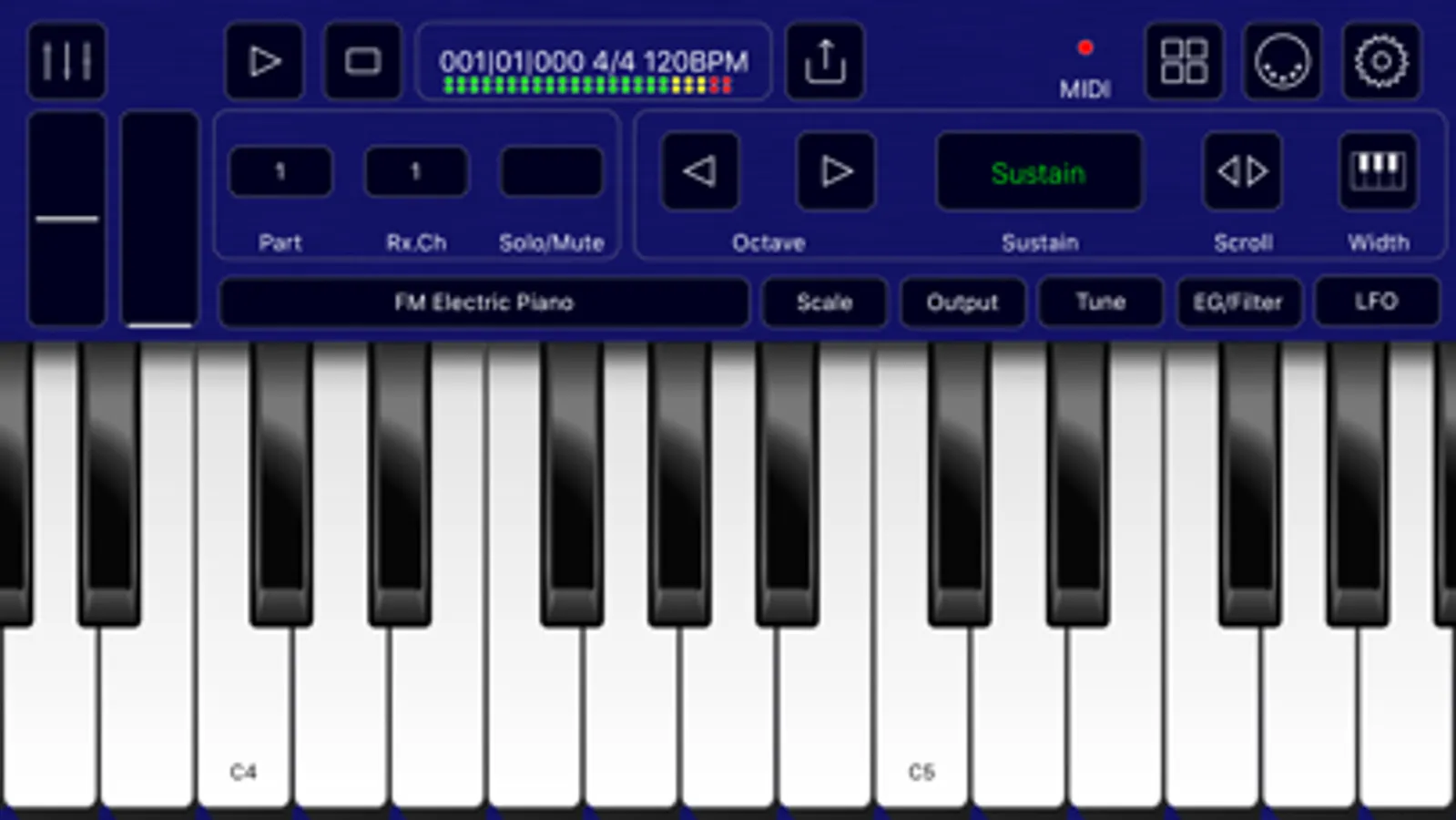 As a keyboard instrument, you can play with the scalable screen keyboard, pitch bend wheel, and many control change controllers.
