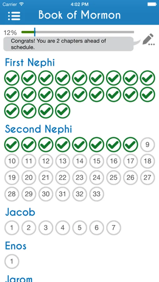 As you read the scriptures in any of the LDS Standard Works, simply tap on the chapters you have read and watch the progress bar instantly update. This app will track which chapters you have read in the Book of Mormon, Doctrine & Covenants, Pearl of Great Price and the Bible.