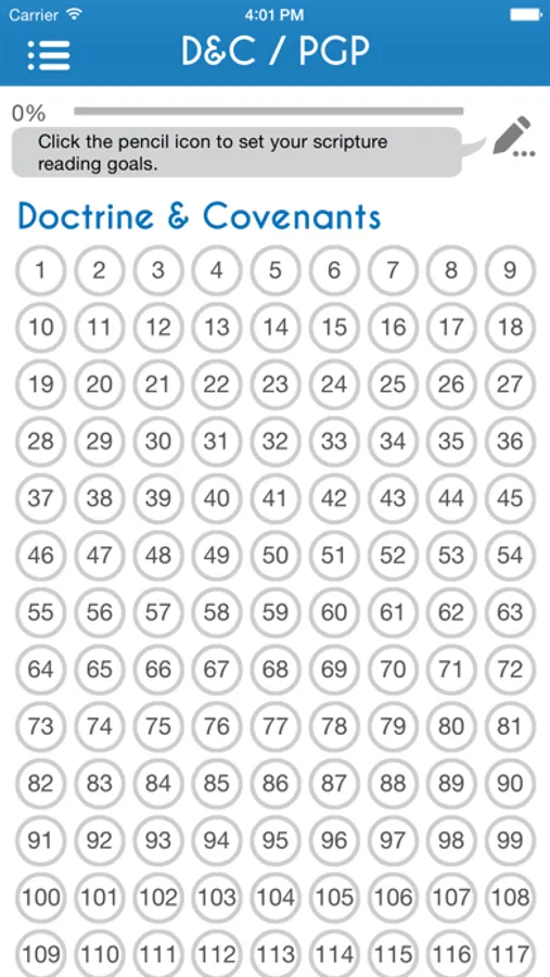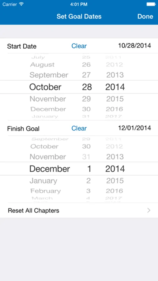 You can also set a goal date when you want to complete any specific scripture volume and Chapter Tap will let you know what chapter you should be reading today and display if you are ahead or behind your goal.