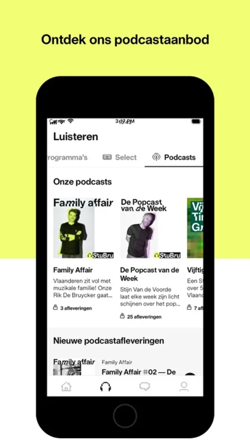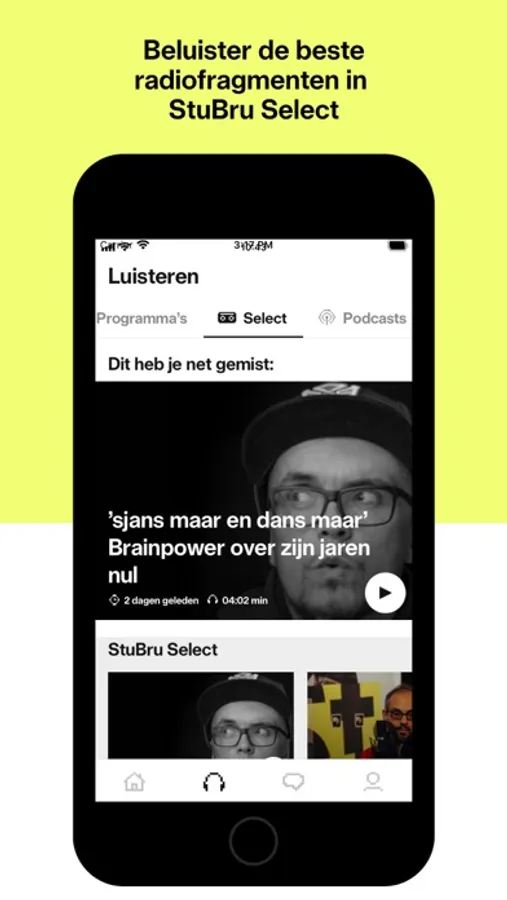 Daarbovenop biedt de app een breed aanbod aan on-demand audio: de beste radiofragementen in StuBru Select, de laatste uitzendingen van programma’s en onze podcasts, allemaal in één app.