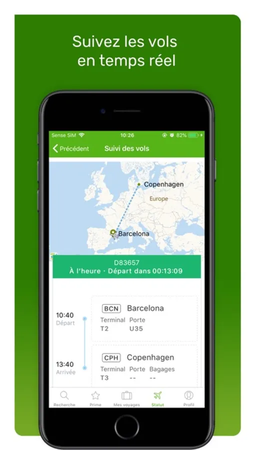 - Créez un compte et recevez des notifications de l'état du vol en temps réel : numéros de portes, tapis à bagages, retards ou annulations et plus encore