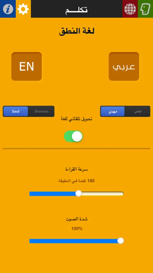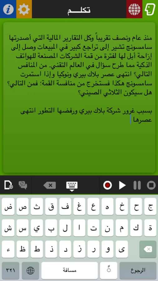 تكلم هو اول برنامج على اجهزة الأي-فون والأي-باد والأي-بود تاتش يتكلم العربية، نعم البرنامج يمكنك من تحويل النصوص العربية والإنجليزية الي كلام مسموع، الان هذه التقنية لم تعد حكراً على الغرب فكم وددنا من قبل وضع نص عربي ثم يقرأ لنا ونحن نؤدي اعملاً اخرى. مثل قيادة السيارة او القيام بأعمال يدوية تتطلب من بعض التركيز البصري