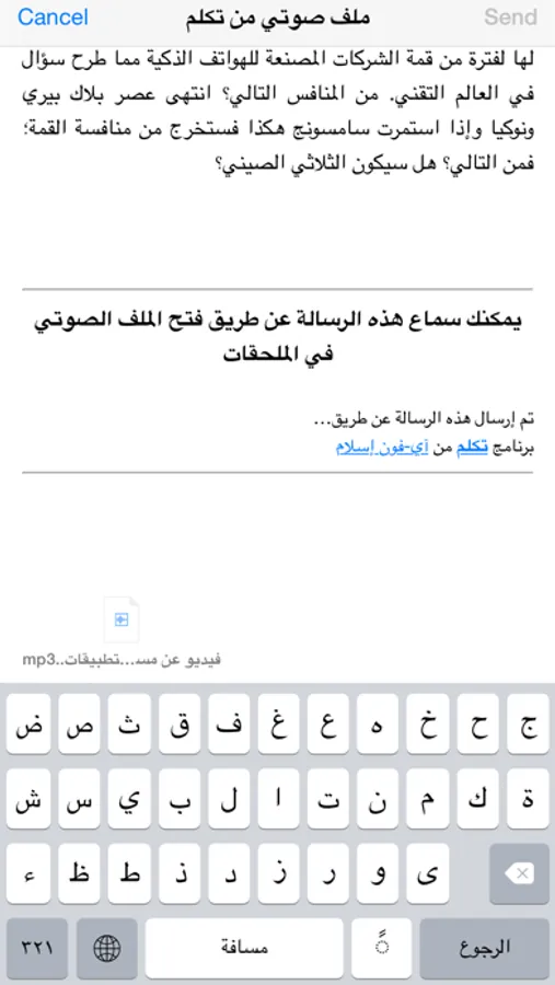 احد مميزات البرنامج الرائعة انه يتيح لك ارسال مقال مقروء لصديق على بريده الإلكتروني وبذلك تشارك اصدقائك المقال ليس نص فقط ولكن ايضاً مسموع