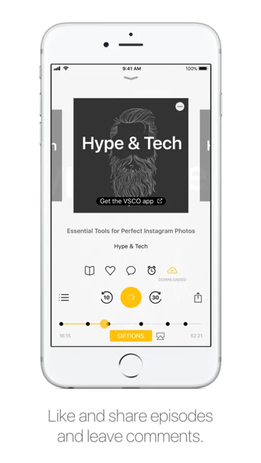- Show your podcast love through like, comment, and share options,