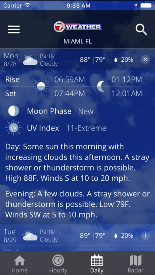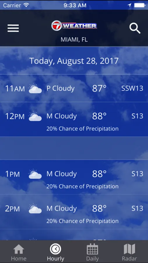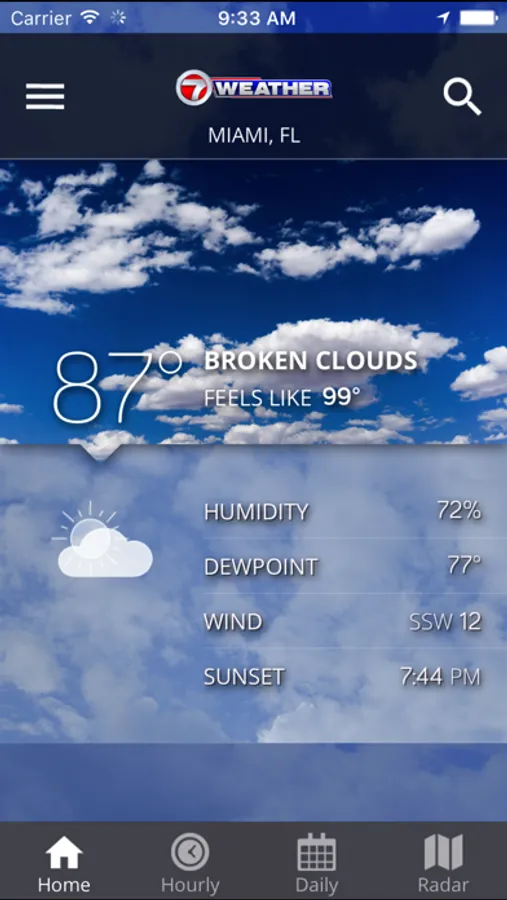 The 7 News Weather app provides the forecast, current conditions, radar, storm tracking and other weather information for Miami-Dade, Broward and Monroe counties. You will receive up-to-the-minute conditions along with the hourly and seven day forecast. The interactive radar map provides real-time, animated radar and satellite info for anywhere in the U.S.  You can also keep up with travel conditions by typing in any city or state to get current weather information. And of course, should a hurricane threaten, you will get all the information you need to track the storm.