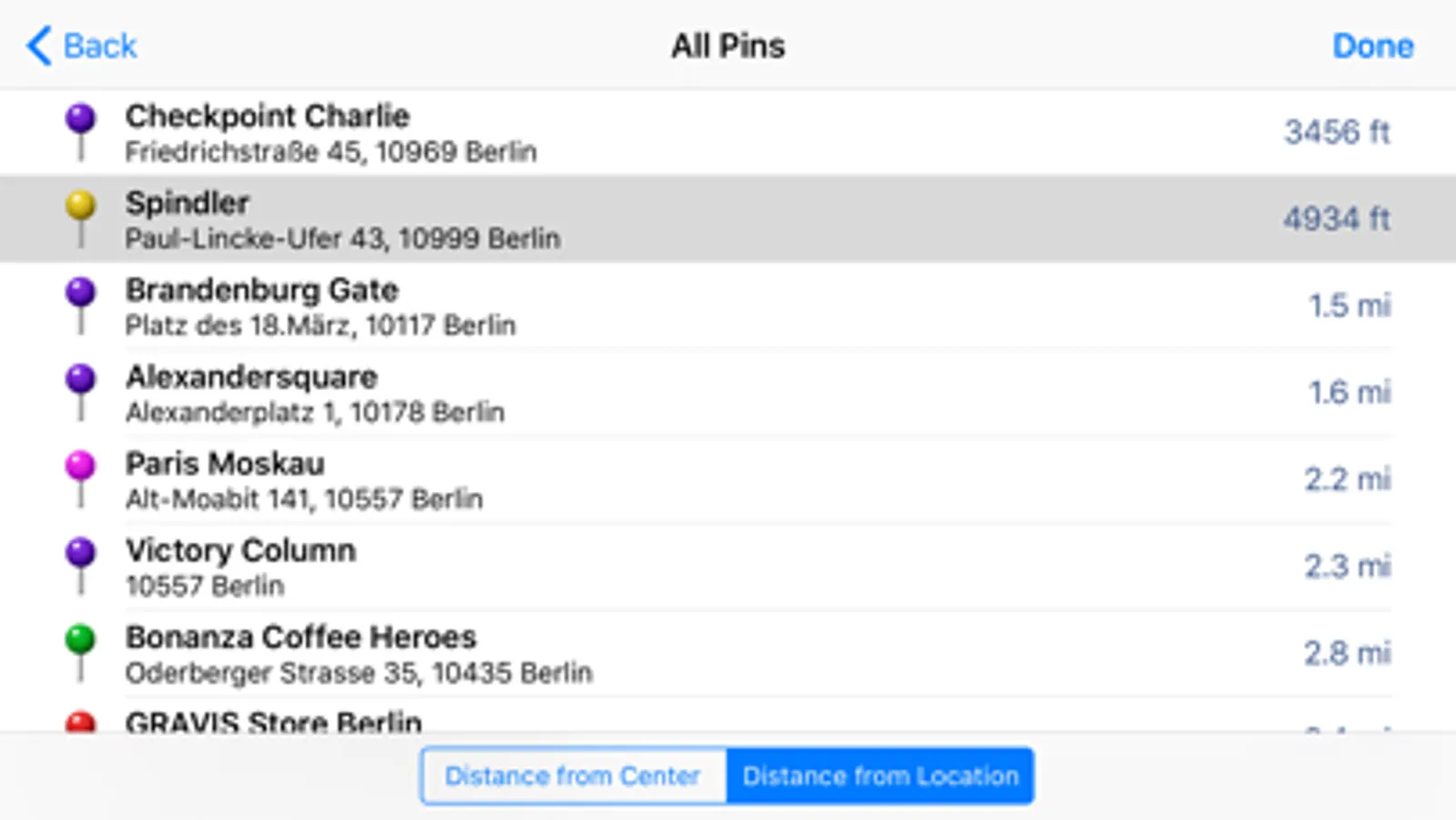 • Lists of Pins order by distance to map center or current location (*).
