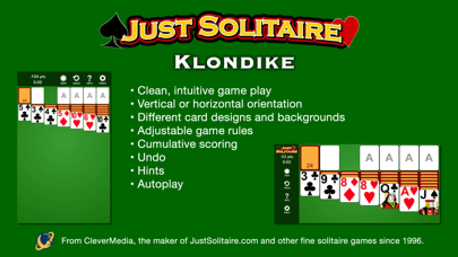 Play Klondike solitaire, the most popular solitaire game. Also called patience or just "solitaire." You can play by dragging or tapping. You can change the number of cards issued from the stock, and how many times you can turn the stock over. You can choose between different backgrounds, card designs, scoring methods and other options.