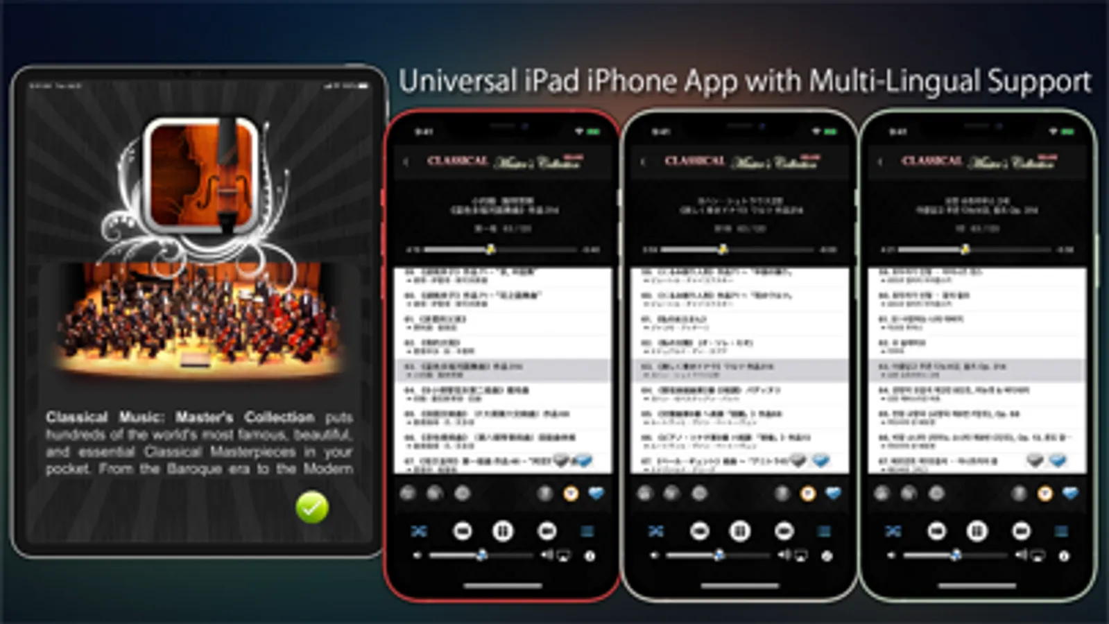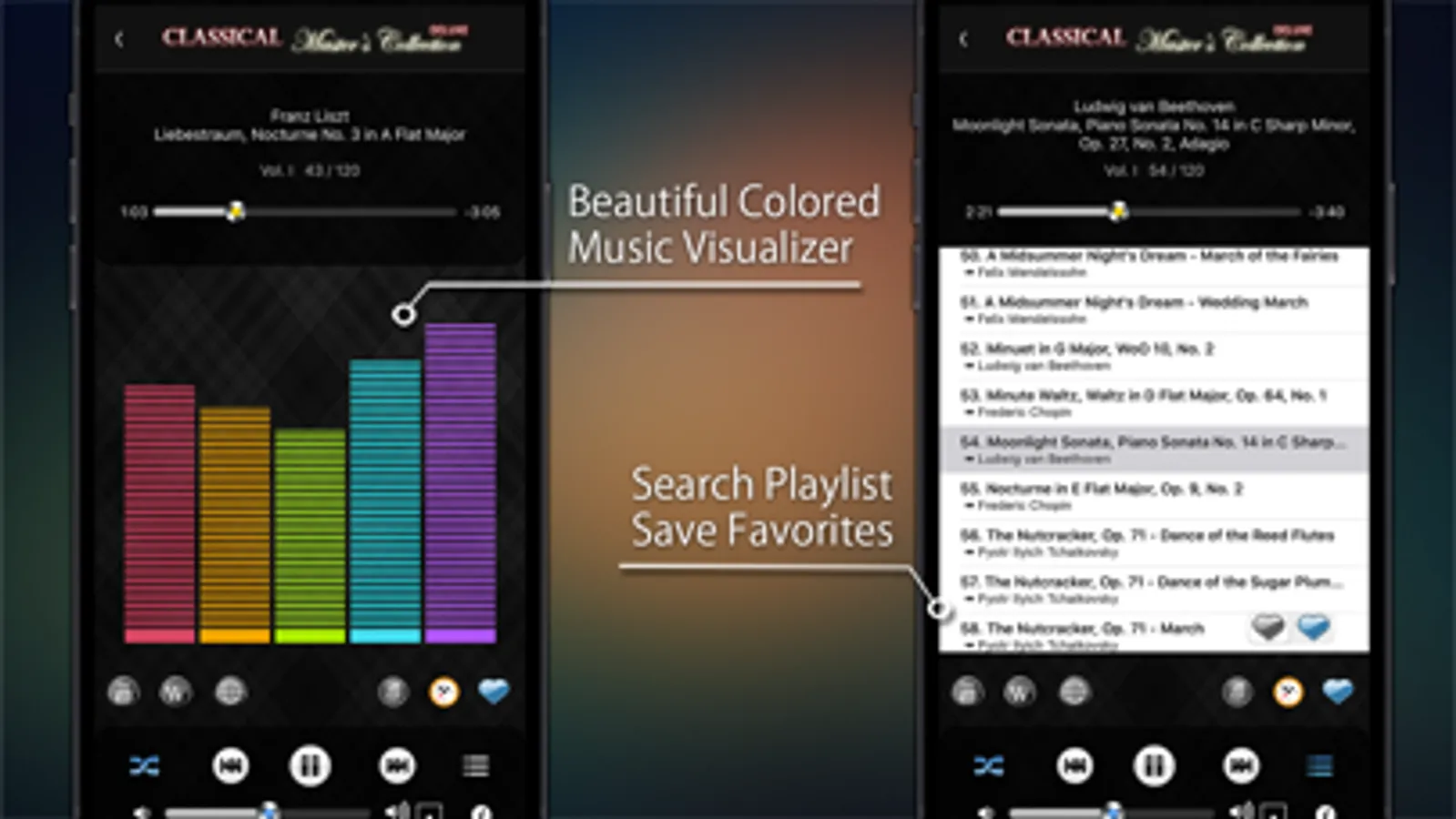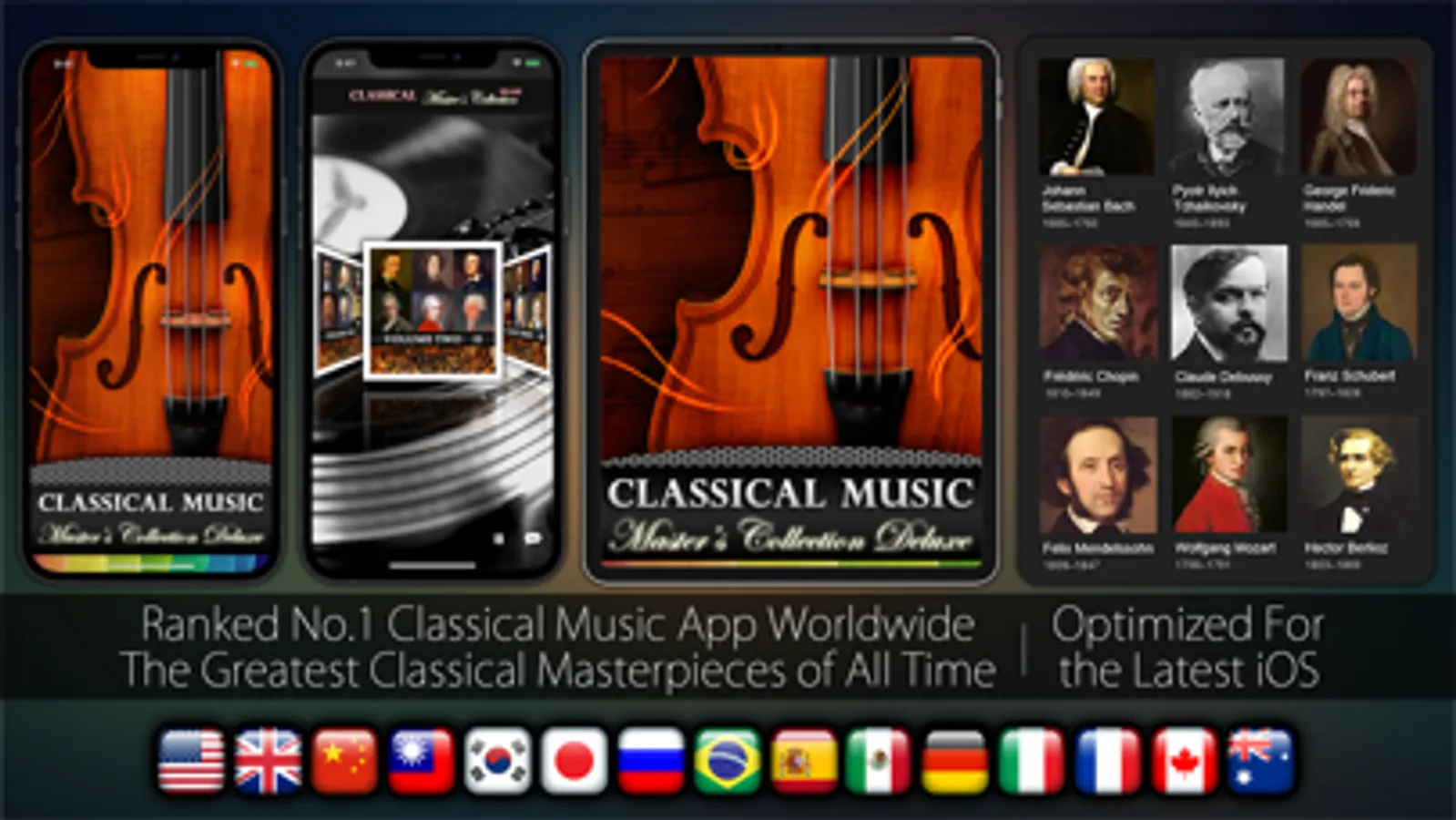 Enjoy the timeless works as you listen from Mendelssohn's Wedding March, to Chopin's Funeral March; from Strauss' Blue Danube, to Beethoven's Symphony No. 5; from Tchaikovsky's Swan Lake, to Prokofiev's Romeo and Juliet; as well as pieces like Moonlight Sonata, Ave Maria, Waltz Of The Flowers and Canon In D. Now fully compatible with the latest iOS. We hope you'll love it!