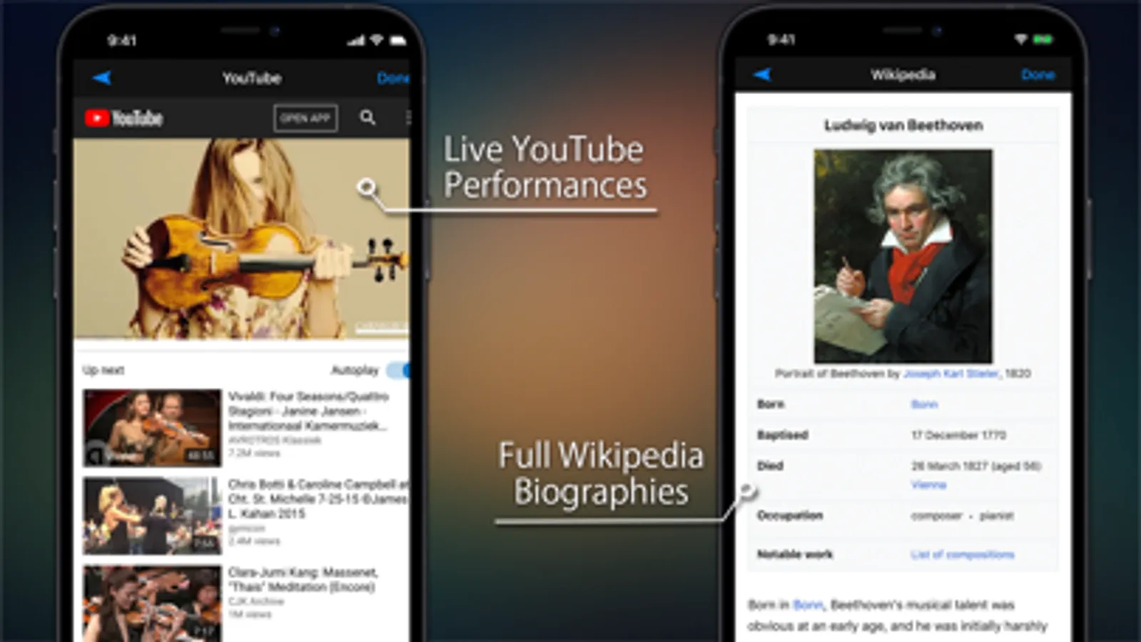 Search and organize your favorite pieces with favorite list. Fall asleep with sleep timer. Plus, easily discover and learn more with YouTube live performances and Wikipedia composer info for each masterpiece right in the app.
