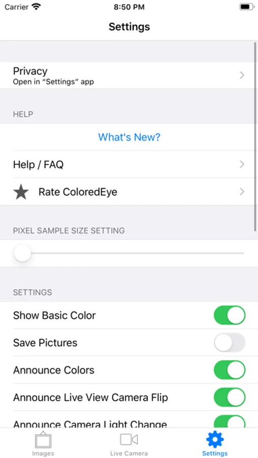 Simply use your iPhone or iTouch to take a photo in good lighting, then pick an object or location within the photo for ColoredEye to classify, or use the live camera mode to find out colors instantly.