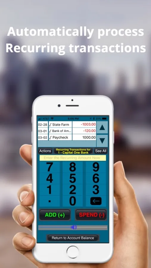 This app has a large custom numeric keypad and you only need to enter the amount and tap “Add” or “Spend” for debit accounts or "spend" or "payment" for credit accounts. If you want to add a transaction description, just type it or select one from the description selection list.