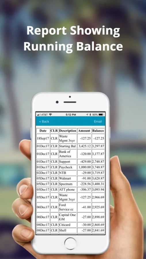 Balance Now lets you generate custom reports by specifying a date range and optionally any transaction description or transaction amount. Reports shows the date, pending flag, description, amount, balance and cleared balance. You can optionally email the report to yourself or anyone else.
