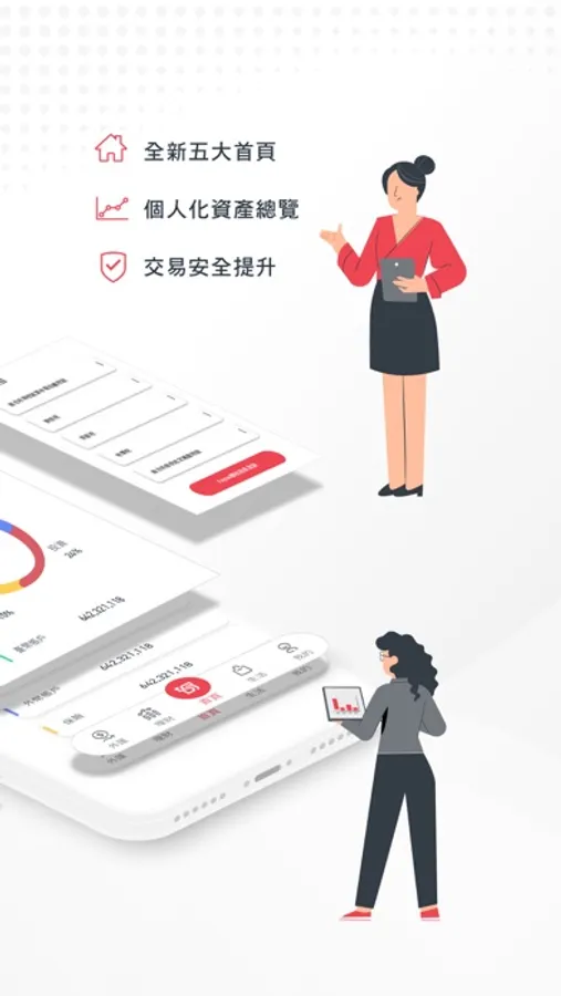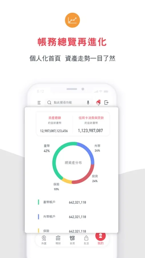 四、【個人資產分佈及快速預覽】:為您清楚計算各類型資產金額及比例配置,圖像式呈現一目了然,也可以在主首頁輕輕下拉,不須登入就可以看到隱藏版的資產金額喔!