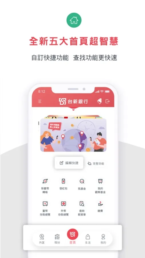 一、【個人化首頁服務】:包含主首頁、外匯、理財、生活、我的五大首頁,並可依個人需求調整資訊區塊版位,透過個人化首頁提供您各產品即時豐富的資訊,以簡單清楚的圖表,讓您快速掌握匯率黃金走勢及進場時機。