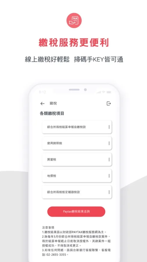 五、【提供多元繳稅服務】:提供線上繳稅服務,透過掃描稅單或輸入帳單上欄位資訊,可快速繳納綜合所得稅、牌照稅、房屋稅、地價稅等項目。