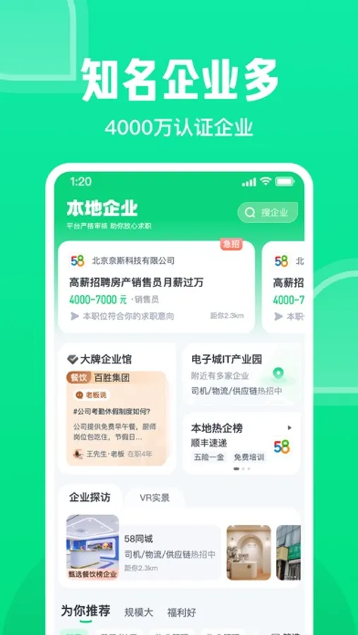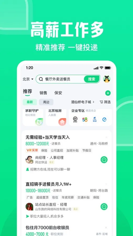 工资高、离家近、稳定、福利待遇好的工作应有尽有。百强名企入驻,轻松入职知名企业,让你在亲朋好友面前面子十足。随时随地,一对一直接沟通老板,当场敲定工资。