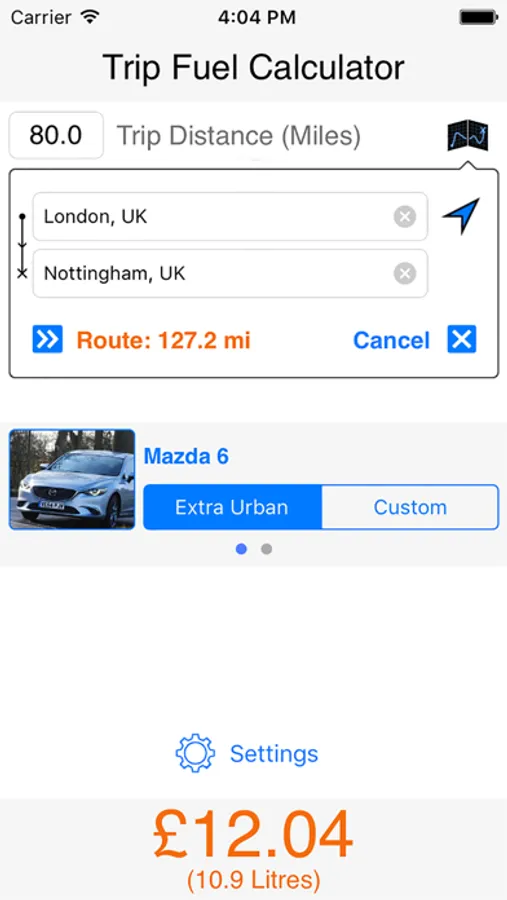 Trip Fuel Calculator determines how much fuel your car would use to get between two locations and displays how much that will cost!