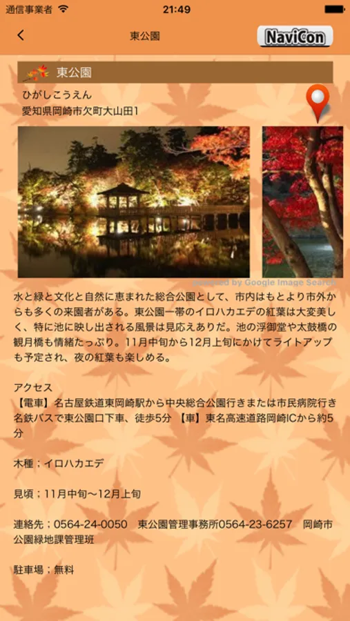 紅葉スポットの概要、住所、アクセス方法、Google画像検索による代表画像、樹種、見頃の詳細情報を掲載しています。