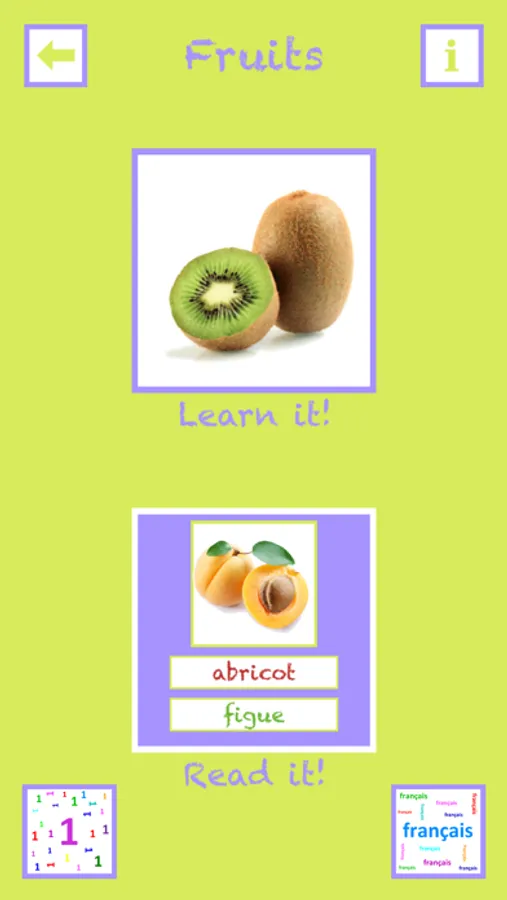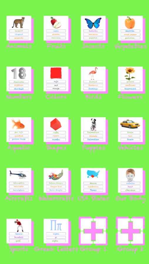 App with a delightful design with words grouped in themed collections, with their images and narrations in English, French, and Spanish.