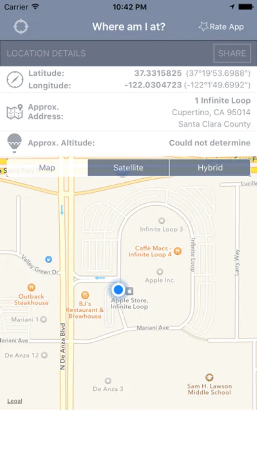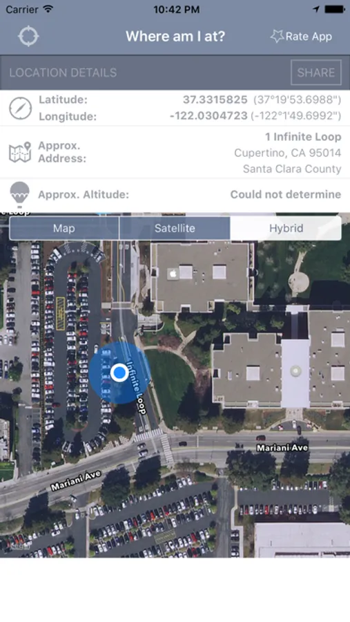 Simply open the app to have your iPhone or iPad device instantly zoom in on your position. Coordinates, address, and even altitude will be displayed so you know your exact location.