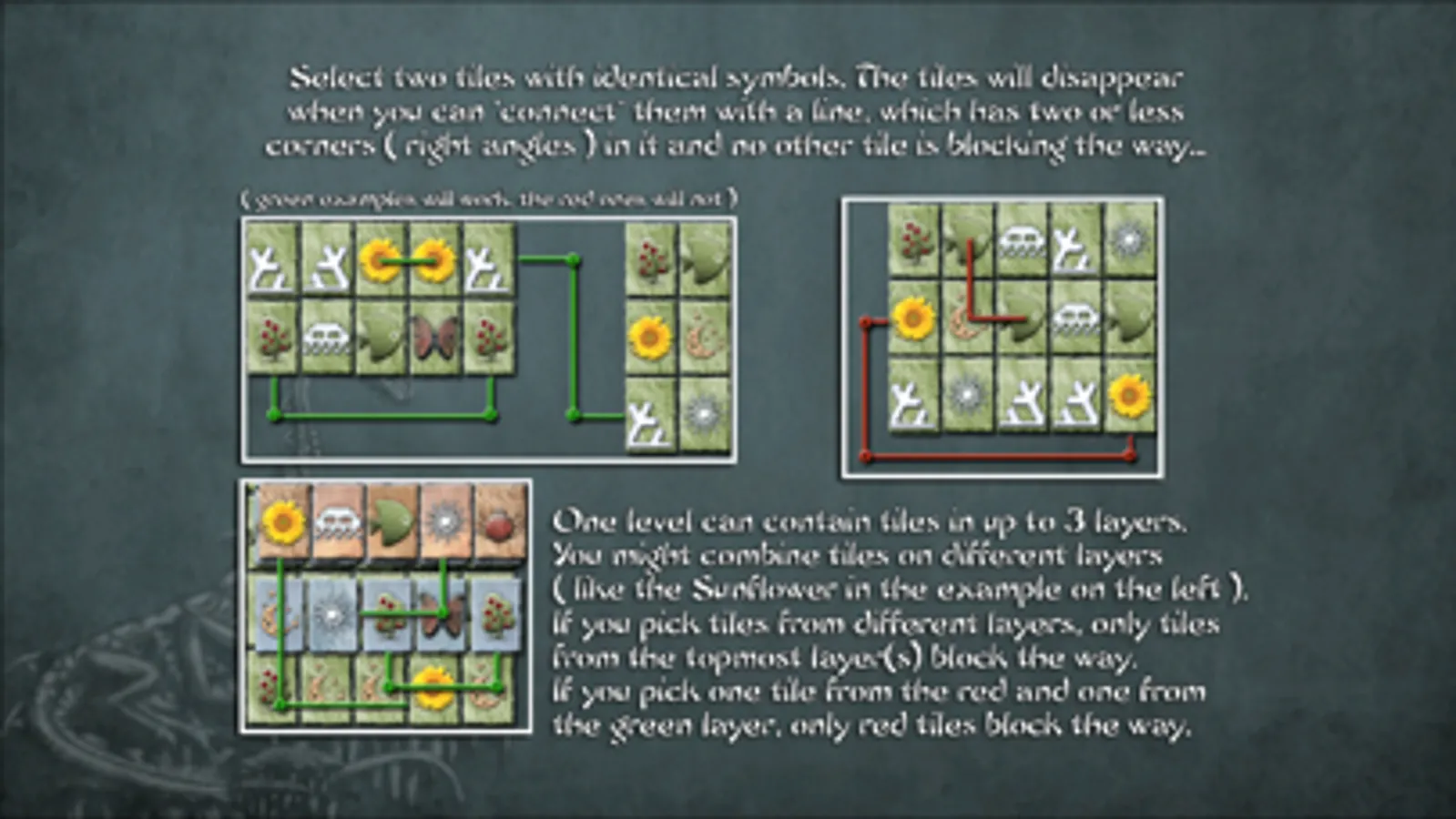 Clear the board by finding two items with identical symbols. The tiles will disappear when you can 'connect' them with a line, which has two or less corners ( right angles ) in it and no other part is blocking the way. Advance to the next level by clearing the board. If you run out of time before you finish a map, you lose.