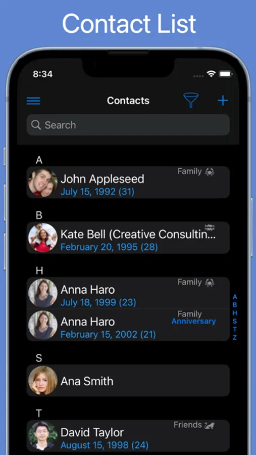 Stay effortlessly organized and ahead of the game with the most user-friendly birthday app out there! Seamlessly sort your birthday list by date or efficiently arrange your contact list by name, ensuring a streamlined view of all your essential information. And with the convenient calendar view, you'll have a bird's eye vantage point to promptly glance at upcoming celebrations. Say goodbye to missed birthdays and hello to stress-free planning with our easy-to-use birthday app!