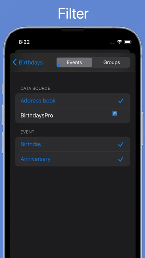Refine your list with precision! Easily filter by calendar event types or round events, such as anniversaries recurring every 5, 10, or more years. Plus, filter by address book groups, ensuring all your most important contacts are conveniently organized and accessible in one centralized location.