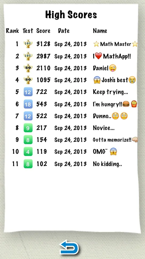 ** Note regarding scoring system (related to a review comment): MathApp - Times Table uses smart scoring system where the test scores are calculated based on difficulty level of the times tables. If you take a test with 1 x 1 = 1, 1 x 2 = 2, 10 x 1 = 10, 10 x 2 = 20 types of questions only, the total score will be very low even if you answer all of the questions correctly. You will need to memorize higher numbers tables, and try to answer each question as quickly as possible to record higher scores. This smart scoring system motivates your child to memorize more times tables. **