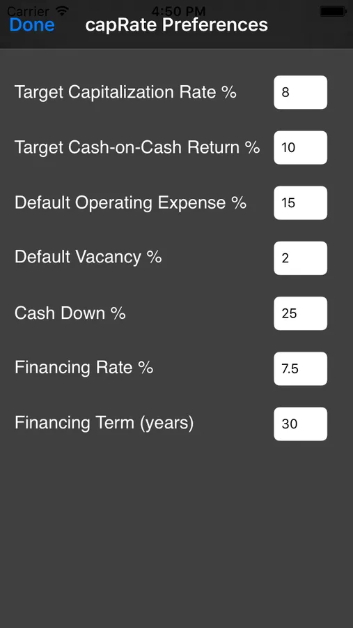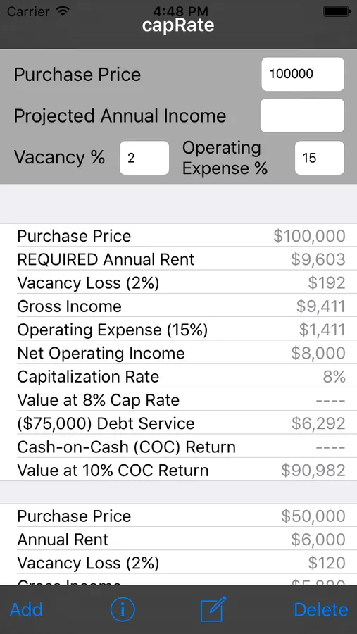 This app helps you to quickly model and analyze income producing properties to determine the price to offer based upon how much you want to earn on the cash you invest. You can also easily determine the rent you would need to collect in order to justify a given price. This simple tool gives you facts to help negotiate a great price in the current real estate market. It lets you work with multiple different scenarios, adjusting target capitalization rate, target cash-on-cash return, estimated vacancy, operating expenses, down payment, financing rate and term to match your personal goals and assumptions. Stop wasting time, in less than a minute you can size up a potential deal and know if its worth getting in the car to take a closer look.