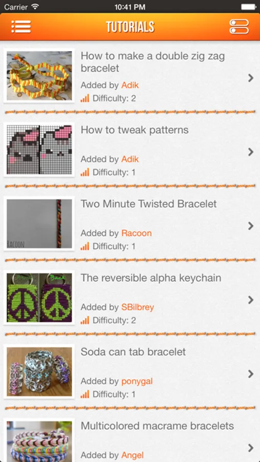 For more info about BraceletBook please visit BraceletBook.com. Learn how to make friendship bracelets and start tying today! Do you like making friendship bracelets? Then BraceletBook is the right app for you. It's full of normal & alpha patterns, both easy and hard. You can use filters to find patterns that match your skills, which makes finding the right ones much easier. BraceletBook also contains a To-Do list. You simply click on the "Add To-Do" button and you'll never forget what bracelet you wanted to make for your friend! If you don't know how to make friendship bracelets, there are lots of tutorials for you to read and learn from.