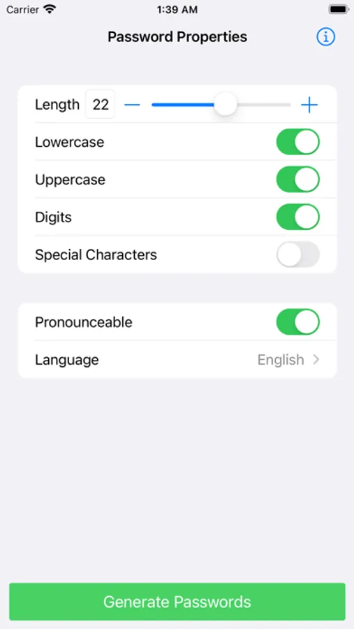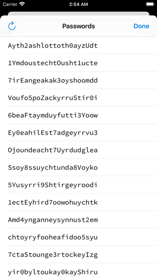 For added convenience, Pronounceable Password Generator presents you with a whole list of generated passwords to choose from. The password you select can then be copied to the clipboard right away by simply tapping on it. If you, however, do not like any of the passwords in the list, you can generate another bunch easily by tapping the refresh button.