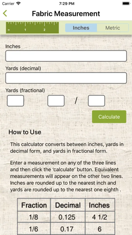 Fabric Measurement Converter: Converts between inches and yards in decimal form, and yards in fractional form. (With metric equivalents.)