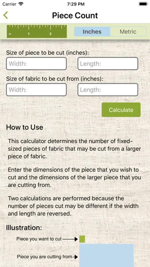 Piece Count Calculator: Shows the number of fixed-sized pieces of fabric that can be cut from a larger piece.