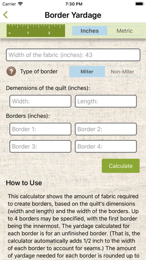 Border Calculator: Shows the amount of fabric required to create borders, based on a quilt’s dimensions and the width of the borders.