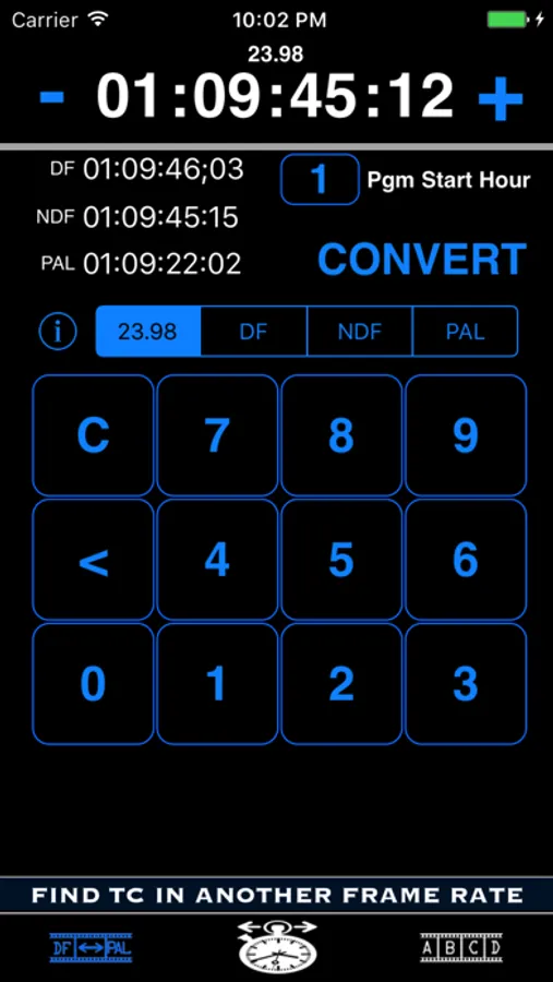 The primary feature of Timecode Tool gives the user the ability to convert between 23.98, DF, NDF and PAL timecodes. PAL video runs at a faster speed than NTSC and consequently causes issues when trying to find the same spot in a feature film between those standards. Perhaps you are performing a QC pass on a PAL version of a feature film and find an issue at 2:14:30:23. How do you find the same spot in the NTSC version? Timecode Tool will easily allow you to enter the PAL timecode of 2:14:30:23 and will return to you the equivalent 23.98, DF, and NDF timecodes. It has a default value of 1 Hour as the starting time of your program material but the other 23 even hours can be selected if necessary. (A future version may allow the user to select a specific "non-even hour" timecode if there are enough requests)