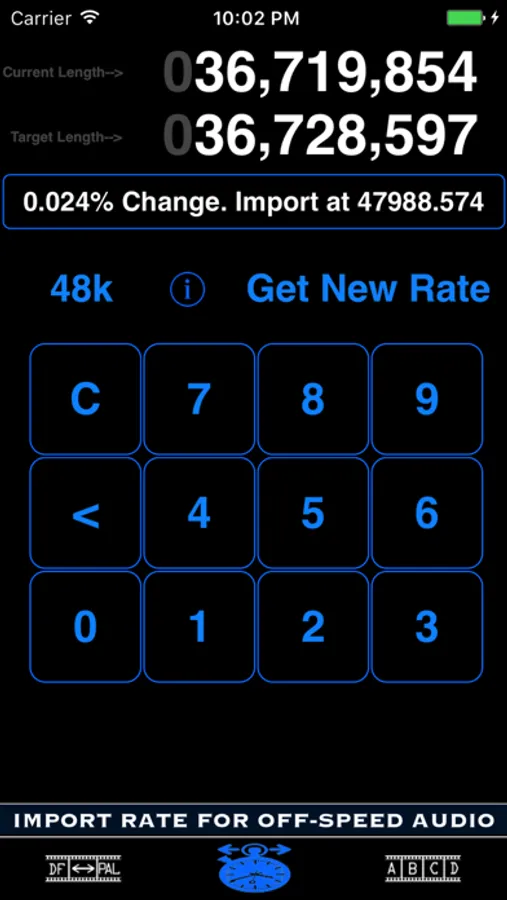 The second feature of Timecode Tool helps the user vari-speed audio that is currently running at the wrong speed. The hope is that you are using a software program that allows you to convert your audio by entering a specific sample rate ("Import Audio"). Both the difference in percentage and the correct sample rate necessary to vari-speed (VSO) when importing/exporting are provided. Example: you may have an audio file that is 20 frames shorter than it is supposed to be. After entering that file's current length, target length, and current sample rate, a simple math calculation is performed and the user is provided with the numbers necessary to import that file at a custom rate where it should stay in proper sync.