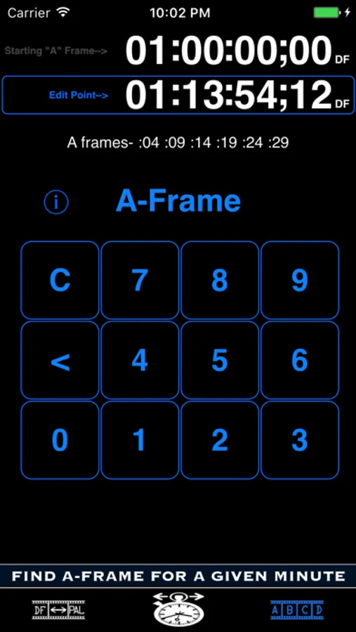 The third feature is A-Frame Verification. A-Frames occur on the same frames from second to second within a given minute. If you need to locate an A-Frame to keep the proper cadence when editing, tap the upper timecode to change the starting A-Frame for your program material/feature (if other than 01:00:00:00) and then tap the lower timecode to enter your edit point. Touch the A-Frame button to display the frames on which your A-Frame will occur within that given minute of time.
