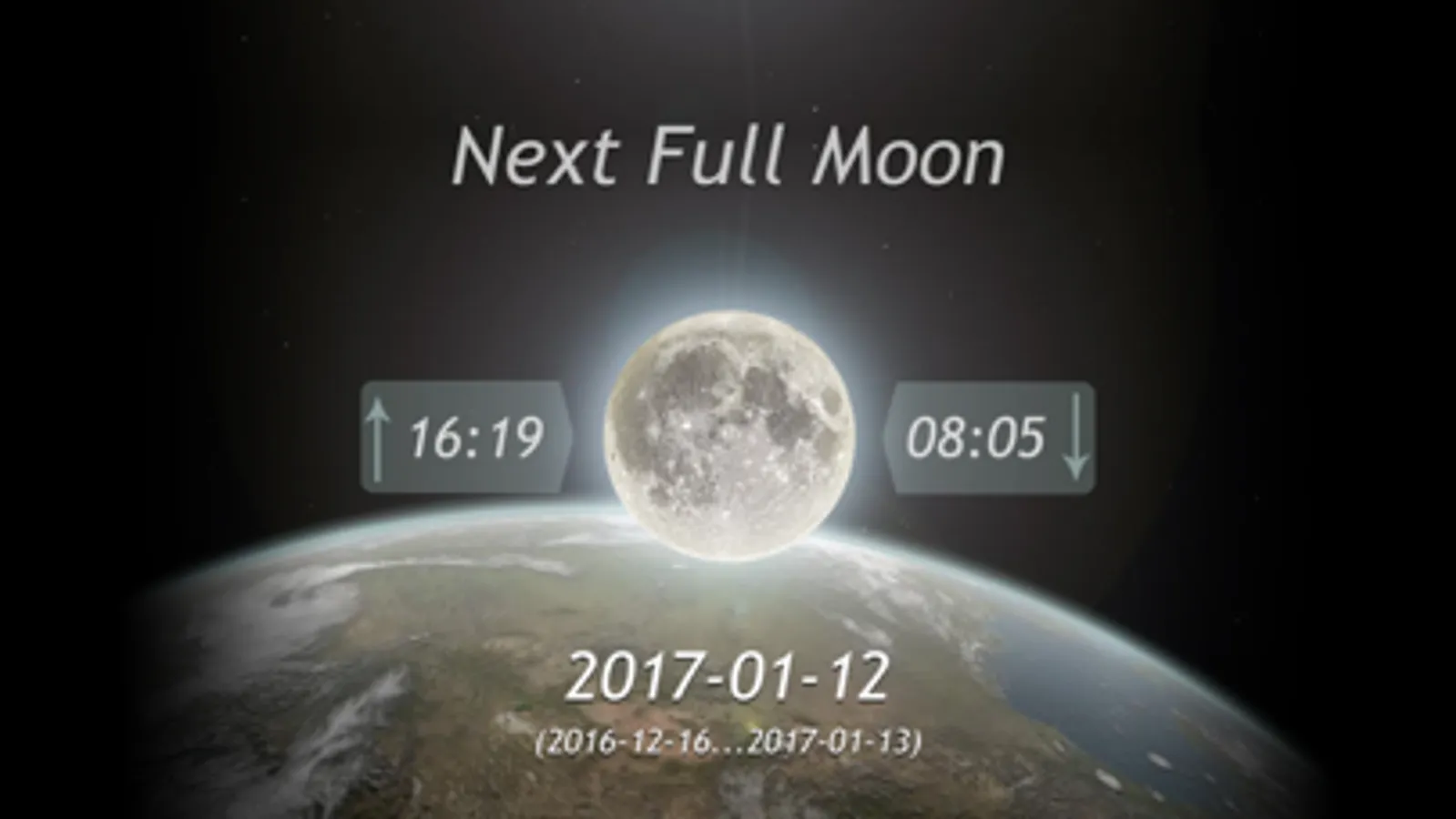 AVIA Moonrise is an application that presents an accurate moon phase and the official sunrise, sunset, moonrise, and moonset times for any place on Earth and for any date between Jan 1,1900 and Dec 31, 2099.