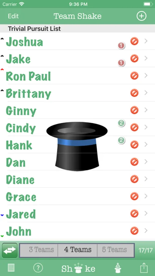 Team Shake is the premier iOS App for creating teams. Instead of a hat and scraps of paper, the user enters his friends' names in his iPhone and gives it a shake. The screen will then display a random set of color-coded teams. These teams can immediately be used for game play or shared via facebook or email. The quick and easy selection of random (or balanced) teams eliminates fighting over who will be on which team. Innovative use of the iPhone shake gesture gives users the satisfying feeling of shaking a virtual hat without the trouble of carrying around an actual hat. Conventional buttons can also be used for those who would rather not shake their expensive hardware about.