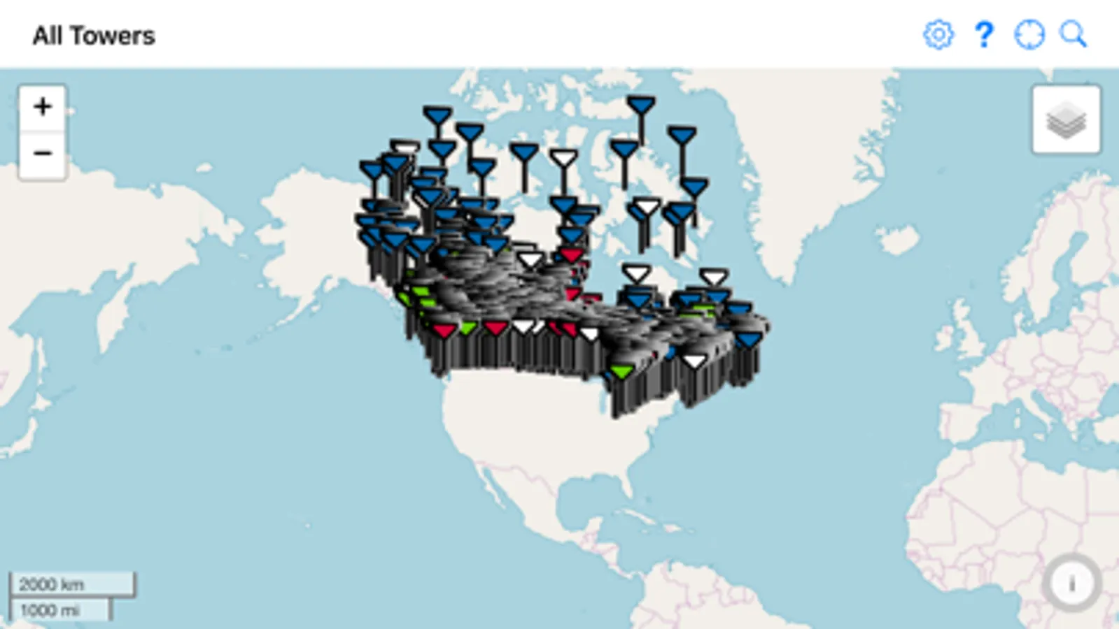 A map to locate cellular provider towers within Canada. Includes all the big and small providers.