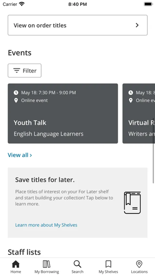 • Keep track of your interests: add titles to your “For Later” shelf so you can read them later.
