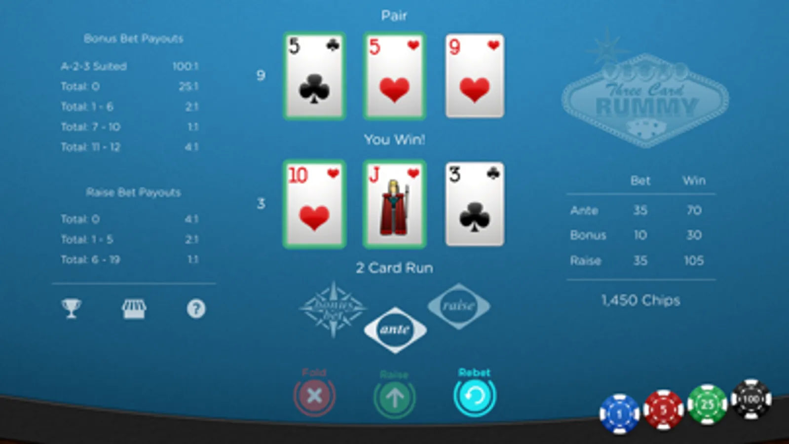 Vegas Three Card Rummy is a fun poker variation that combines elements of the popular card game Gin Rummy with the casino card game Three Card Poker. The game is played directly against the Dealer with three-card hands dealt from a single 52-card deck. The scoring of the hands is very different from typical card games since the object of the game is to get fewer points than the Dealer.