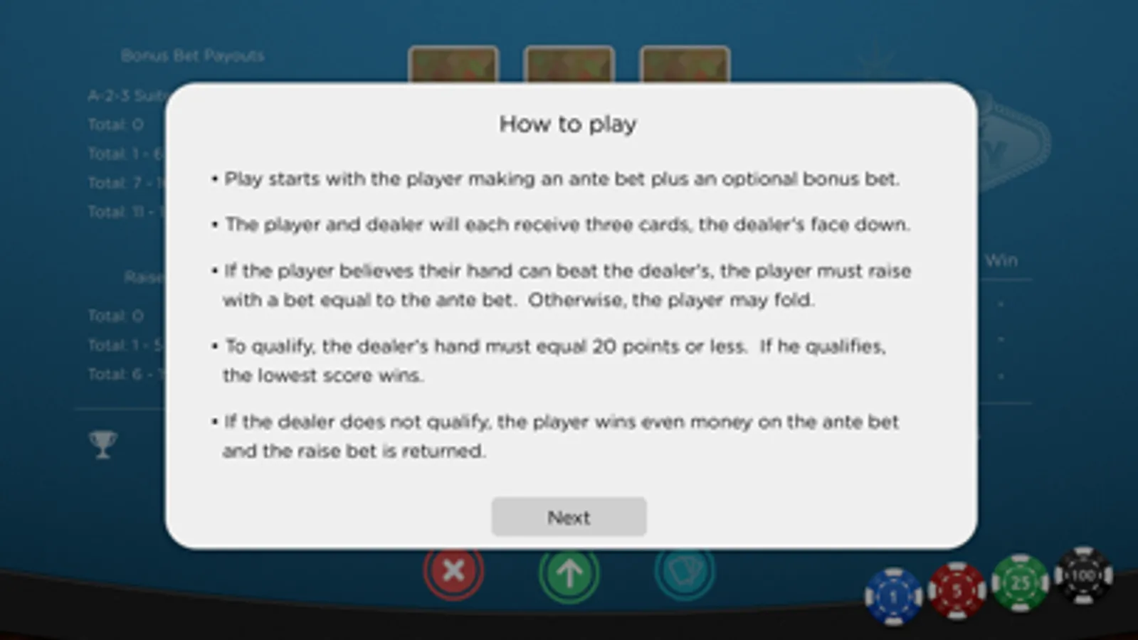 The Dealer turns over his/her cards only after the Raise bet has been made. The Dealer’s hand must have 20 points or fewer to qualify. If the Dealer does not qualify, the Player wins even money on the Ante regardless of the total, while the Raise is refunded as a “Push,” no winner. If the Dealer and Player hands are of equal value, both the Ante and the Raise wagers are returned as a Push, no winner.