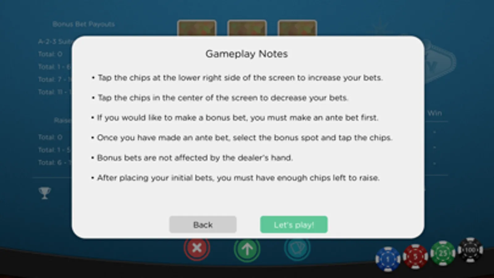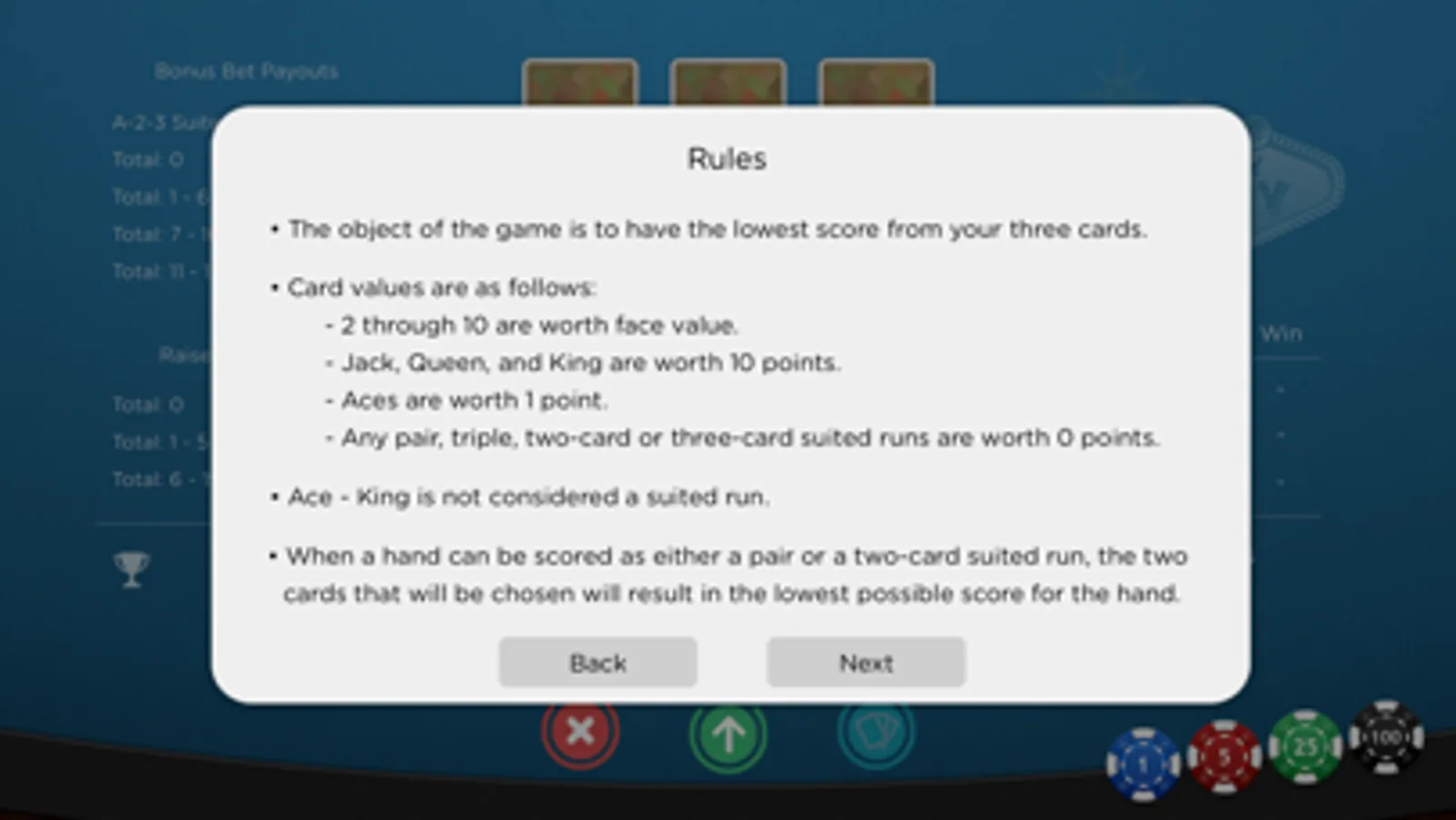 There is also an optional Bonus Bet that can be made prior to each deal. This bet automatically loses if the Player’s hand total is thirteen or more points. Otherwise, it earns a bonus payout of 4-to-1 for a value of eleven or twelve points, even money for seven to ten points and 2-to-1 for one to six points. A total of zero earns 25-to-1 and the suited A-2-3 is worth 100-to-1.