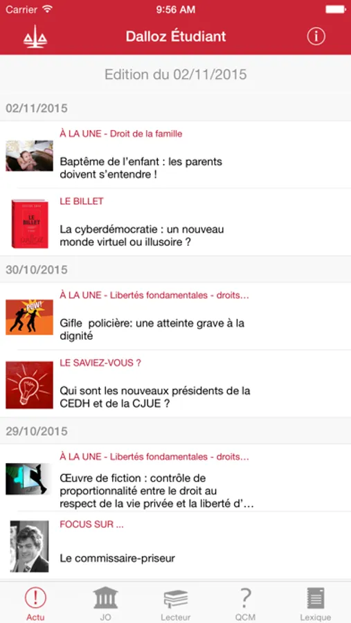 - A l’ensemble des actualités issues du site Dalloz Actu Étudiant : le Billet hebdomadaire, de l’actualité juridique quotidienne commentée en lien direct avec les matières dispensées en faculté (À la une), des interviews (Focus sur, L’assoc du mois), des exercices corrigés permettant de faire le point sur un sujet de droit précis (À vos copies, Le cas du mois) ;