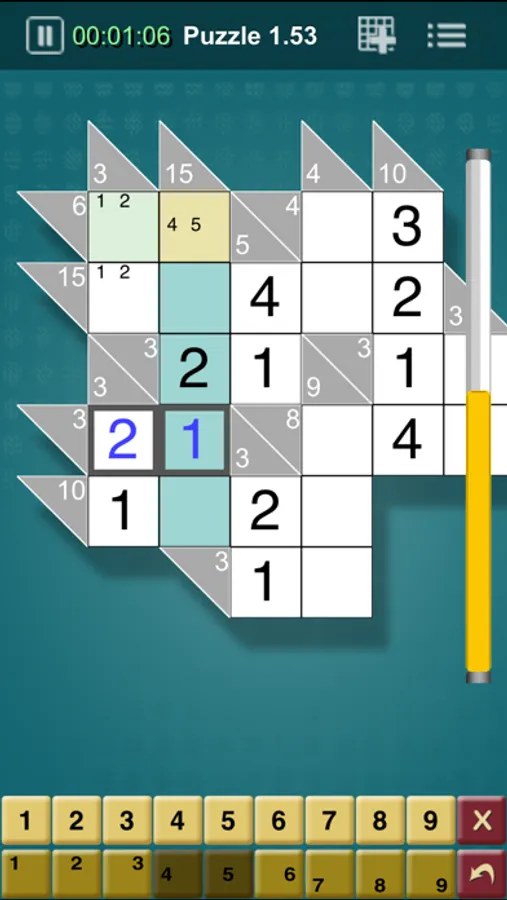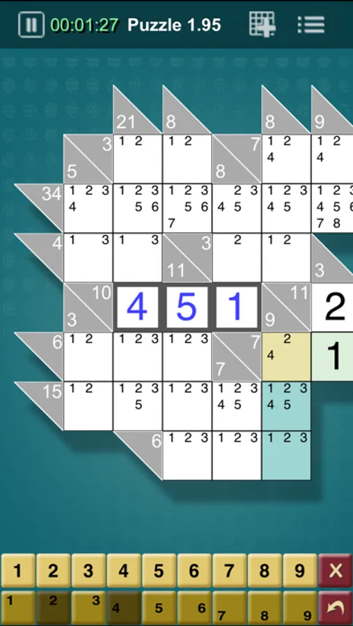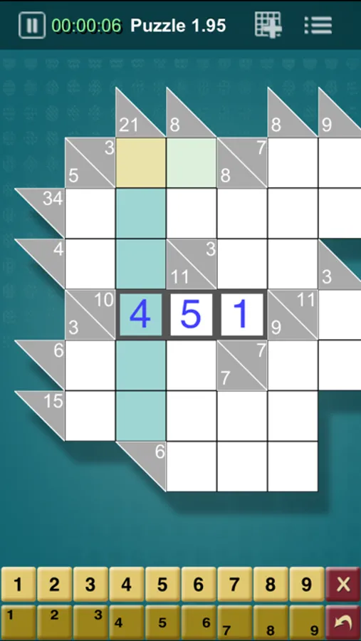 * 'Auto-complete' – This feature auto-fills a cell when only one possible answer remains. For instance, if you have a 2-cell row with a sum of 6, if you enter a 5 in one cell, the other cell will automatically be filled with a 1.