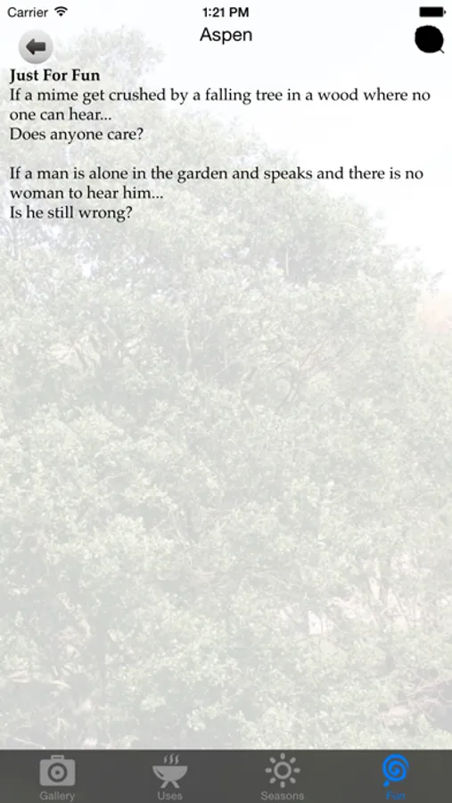 GetWise with Trees is a fascinating guide with photos, facts, jokes, riddles and quotations about trees. All the photos are stored in the App so you will never be without your own pocket identification guide even in the remotest places! There are 40 standard tree types, with simple identification information and loads of photos to zoom in on and compare with the real thing. Check out the Uses, Food/Medicinal, Seasons and Fun sections under each tree for heaps of additional knowledge and things to amuse yourself and others.