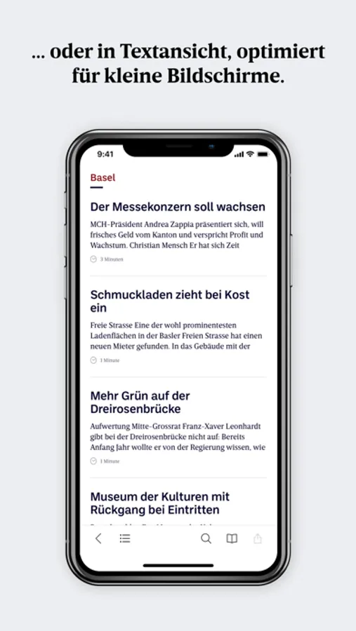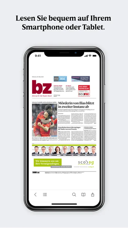 Lesen Sie die aktuellen Zeitungsausgaben der «bz Basel» bequem auf Ihrem Smartphone und Tablet. Es stehen Ihnen dazu das Zeitungslayout oder die mobile Leseansicht, optimiert für kleinere Bildschirme, zur Verfügung.